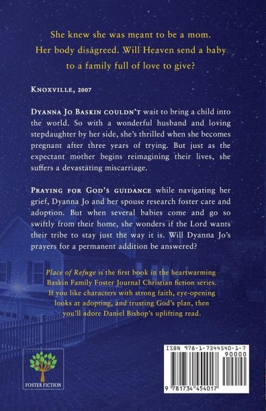 She knew she was meant to be a mom. Her body disagreed. Will Heaven send a baby to a family full of love to give? Knoxville, 2007. Dyanna Jo Baskin couldn't wait to bring a child into the world. So with a wonderful husband and loving stepdaughter by her side, she's thrilled when she becomes pregnant after three years of trying. But just as the expectant mother begins reimagining their lives, she suffers a devastating miscarriage. Praying for God's guidance while navigating her grief, Dyanna Jo and her spouse research foster care and adoption. But when several babies come and go so swiftly from their home, she wonders if the Lord wants their tribe to stay just the way it is. Will Dyanna Jo's prayers for a permanent addition be answered? Place of Refuge is the first book in the heartwarming Baskin Family Foster Journal Christian fiction series. If you like characters with strong faith, eye-opening looks at adopting, and trusting God's plan, then you'll adore Daniel Bishop's uplifting read.