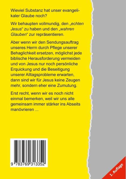 Wieviel Substanz hat unser evangelikaler Glaube noch? Wir behaupten vollmundig, den "echten Jesus" zu haben und den "wahren Glauben" zur repräsentieren. Aber wenn wir den Sendungsauftrag unseres Herrn durch Pflege unserer Behaglichkeit ersetzen, möglichst jede biblische Herausforderung vermeiden und von Jesus nur noch persönliche Erquickung und die Beseitigung unserer Alltagsprobleme erwarten, dann sind wir für Jesus keine Zeugen mehr, sondern eher eine Zumutung. Erst recht, wenn wir es noch nicht einmal bemerken, weil wir uns alle gemeinsam immer stärker ins Abseits manövrieren ...