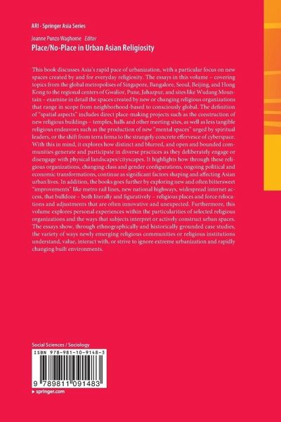 1. Introduction-Negotiating Place, Non-Place, and No-Place.- 2. From Megachurches to the Invisible Temple: Placing the Protestant "Church" in the Seoul Metropolitan Area.- 3. No-Place, New Places: Death and its Rituals in Urban Asia.- 4. Alone Together: Global Gurus, Cosmopolitan Space, and Community.- 5. On Daoism and Religious Networks in a Digital Age.- 6. Losing the Neighborhood Temple (Or Finding the Temple and Losing the Neighborhood): Transformations of Temple Space in Modern Beijing.- 7. Roadside Shrines, Storefront Saints, and Twenty-First Century Lifestyles: The Cultural and Spatial Thresholds of Indian Urbanism.- 8. Cosmopolitan Spaces, Local Pathways: Making a Place for Soka Gakkai in Singapore.- 9. Neighborhood Associations in Urban India: Intersection of Religion and Space in Civic Participation.- 10. Making Places for Vivekananda in Gwalior: Local leadership, National Concerns, and Global Vision.- 11. Carving Place: Foundational Narratives from a North Indian Market Town.