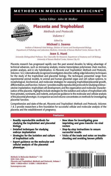 A collection of cutting-edge laboratory techniques for the study of trophoblast and placental biology. The techniques presented range from experimental animal models, to animal and human placental organ and cell culture systems, to morphological, biochemical, and molecular strategies for assessing trophoblast/placental growth, differentiation and function. Volume 1 provides readily reproducible protocols for studying embryo-uterine implantation, trophoblast cell development, and the organization and molecular characterization of the placenta. Highlights include strategies for the isolation and culture of trophoblast cells from primates, ruminants, and rodents, and precise guidance to the molecular and cellular analysis of the placental phenotype. A companion second volume concentrates on methods for investigating placental function.
