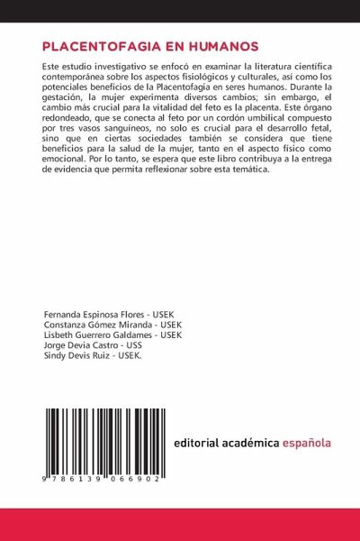 Este estudio investigativo se enfocó en examinar la literatura científica contemporánea sobre los aspectos fisiológicos y culturales, así como los potenciales beneficios de la Placentofagia en seres humanos. Durante la gestación, la mujer experimenta diversos cambios; sin embargo, el cambio más crucial para la vitalidad del feto es la placenta. Este órgano redondeado, que se conecta al feto por un cordón umbilical compuesto por tres vasos sanguíneos, no solo es crucial para el desarrollo fetal, sino que en ciertas sociedades también se considera que tiene beneficios para la salud de la mujer, tanto en el aspecto físico como emocional. Por lo tanto, se espera que este libro contribuya a la entrega de evidencia que permita reflexionar sobre esta temática.