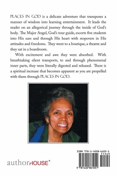 Imagine being inside of God's ear and hearing all the prayers, all the languages spoken in the world. Imagine walking on shiny red embroidery threads that are the heart strings of God. At one point, you must drive a six wheeled bus to move from one area to another. You are transported by thought, led by a Phoenix and instructed by the Major Angel. This book is an allegorical journey that will find a permanent home in your heart and in your library. Places in God is a delicate adventure that transposes a manner of wisdom into learning entertainment. It leads the reader on an allegorical journey through the inside of God's body. Five students follow the Major Angel, God's tour guide, into His ears and through His heart with stopovers in His attitudes and freedoms. They went to a boutique, a theater and sat in a boardroom. With excitement and awe they were absorbed. With breathtaking silent transports to and through phenomenal inner parts, they were literally digested and released. There is a spiritual increase that becomes apparent as you are propelled with them through Places in God.