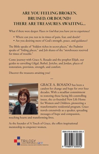 ARE YOU FEELING BROKEN, BRUISED, OR BOUND? THERE ARE TREASURES AWAITING... What if there were deeper Places in God that you have yet to experience? ¿ Where can you run to in times of pain, fear, and doubt? ¿ Are you desiring more of God's strength, peace, and guidance? The Bible speaks of "hidden riches in secret places," the Psalmist speaks of "hiding places," and Job shares of the "storehouses reserved for times of trouble." Come journey with Grace A. Rosado and the prophet Elijah, our guides to unveiling Gilgal, Bethel, Jericho, and Jordan, places of restoration, provision, strength, and comfort. Discover the treasures awaiting you!