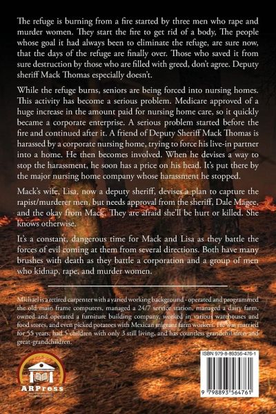 The refuge is burning from a fire started by three men who rape and murder women. They start the fire to get rid of a body. The people whose goal it had always been to eliminate the refuge, are sure now, that the days of the refuge are finally over. Those who saved it from sure destruction by those who are filled with greed, don't agree. Deputy sheriff Mack Thomas especially doesn't. While the refuge burns, seniors are being forced into nursing homes. This activity has become a serious problem. Medicare approved of a huge increase in the amount paid for nursing home care, so it quickly became a corporate enterprise. A serious problem started before the fire and continued after it. A friend of Deputy Sheriff Mack Thomas is harassed by a corporate nursing home, trying to force his live-in partner into a home. He then becomes involved. When he devises a way to stop the harassment, he soon has a price on his head. It's put there by the major nursing home company whose harassment he stopped. Mack's wife, Lisa, now a deputy sheriff, devises a plan to capture the rapist/murderer men, but needs approval from the sheriff, Dale Magee, and the okay from Mack. They are afraid she'll be hurt or killed. She knows otherwise. It's a constant, dangerous time for Mack and Lisa as they battle the forces of evil coming at them from several directions. Both have many brushes with death as they battle a corporation and a group of men who kidnap, rape, and murder women.