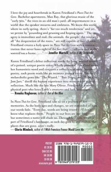 I love the joy and heartbreak in Karen Friedland's Places That Are Gone. Bachelor apartments, Man Ray, that glorious music of the "early 90s," the trees in an old man's yard: all impermanent in a world that the speaker mourns and embraces. We know this world, where in early spring, there's "far too much tenderness" and yet, we persist by "pounding and pruning and hoping again." The imagery is immediate and real; the animals, the people, the trees with all "the desperation of the roots," are still capable of love. Karen Friedland creates a holy space in Places That Are Gone with a concentration that never loses sight of the fact that ". . .all you ever really wanted/was a home. . . ." - Jennifer Martelli, author of My Tarantella