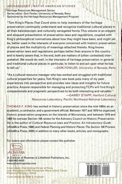 Places That Count offers professionals within the field of cultural resource management (CRM) valuable practical advice on dealing with traditional cultural properties (TCPs). Responsible for coining the term to describe places of community-based cultural importance, Thomas King now revisits this subject to instruct readers in TCP site identification, documentation, and management. With more than 30 years of experience at working with communities on such sites, he identifies common issues of contention and methods of resolving them through consultation and other means. Through the extensive use of examples, from urban ghettos to Polynesian ponds to Mount Shasta, TCPs are shown not to be limited simply to American Indian burial and religious sites, but include a wide array of valued locations and landscapes-the United States and worldwide. This is a must-read for anyone involved in historical preservation, cultural resource management, or community development.