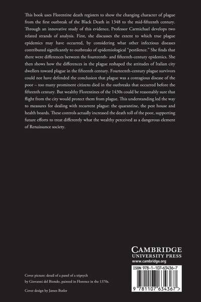 Originally published in 1986, this book uses Florentine death registers to show the changing character of plague from the first outbreak of the Black Death in 1348 to the mid-fifteenth century. Through an innovative study of this evidence, Professor Carmichael develops two related strands of analysis. First, she discusses the extent to which true plague epidemics may have occurred, by considering what other infectious diseases contributed significantly to outbreaks of 'pestilence'. She finds that there were many differences between the fourteenth- and fifteenth-century epidemics. She then shows how the differences in the plague reshaped the attitudes of Italian city-dwellers toward plague in the fifteenth century. This book will be of value to anyone with an interest in the history of the plague, Renaissance Italy and the history of medicine.