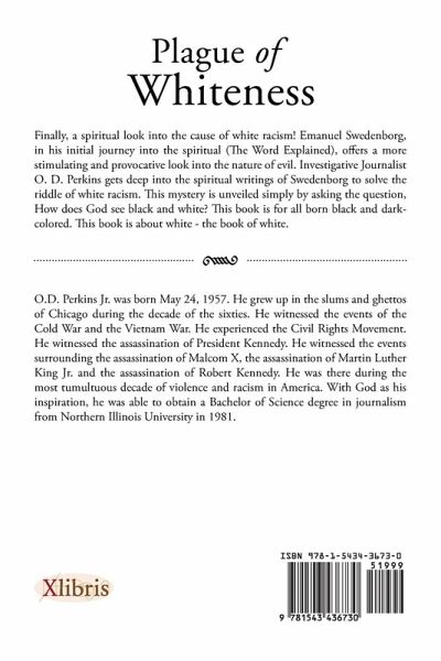 Finally, a spiritual look into the cause of white racism! Emanuel Swedenborg, in his initial journey into the spiritual (The Word Explained), offers a more stimulating and provocative look into the nature of evil. Investigative Journalist O. D. Perkins gets deep into the spiritual writings of Swedenborg to solve the riddle of white racism. This mystery is unveiled simply by asking the question, How does God see black and white? This book is for all born black and dark-colored. This book is about the whites—the book of white.