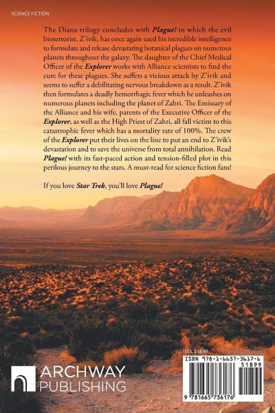 The Diana trilogy concludes with Plague! in which the evil bioterrorist, Z'ivik, has once again used his incredible intelligence to formulate and release devastating botanical plagues on numerous planets throughout the galaxy. The daughter of the Chief Medical Officer of the Explorer works with Alliance scientists to find the cure for these plagues. She suffers a vicious attack by Z'ivik and seems to suffer a debilitating nervous breakdown as a result. Z'ivik then formulates a deadly hemorrhagic fever which he unleashes on numerous planets including the planet of Zahri. The Emissary of the Alliance and his wife, parents of the Executive Officer of the Explorer, as well as the High Priest of Zahri, all fall victim to this catastrophic fever which has a mortality rate of 100%. The crew of the Explorer put their lives on the line to put an end to Z'ivik's devastation and to save the universe from total annihilation. Read Plague! with its fast-paced action and tension-filled plot in this perilous journey to the stars. A must-read for science fiction fans! If you love Star Trek, you'll love Plague!