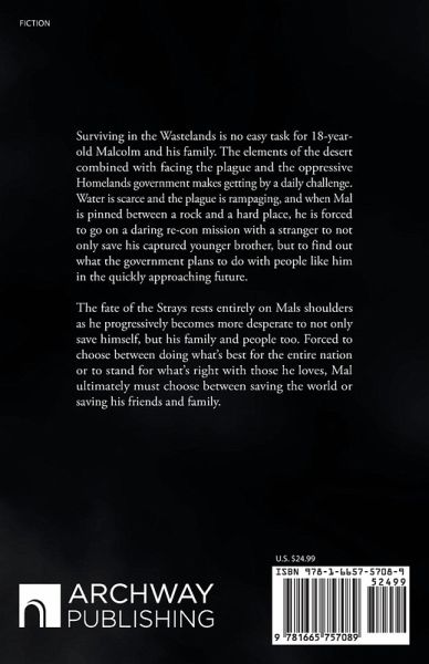 Surviving in the Wastelands is no easy task for 18-year-old Malcolm and his family. The elements of the desert combined with facing the plague and the oppressive Homelands government makes getting by a daily challenge. Water is scarce and the plague is rampaging, and when Mal is pinned between a rock and a hard place, he is forced to go on a daring re-con mission with a stranger to not only save his captured younger brother, but to find out what the government plans to do with people like him in the quickly approaching future. The fate of the Strays rests entirely on Mals shoulders as he progressively becomes more desperate to not only save himself, but his family and people too. Forced to choose between doing what's best for the entire nation or to stand for what's right with those he loves, Mal ultimately must choose between saving the world or saving his friends and family.