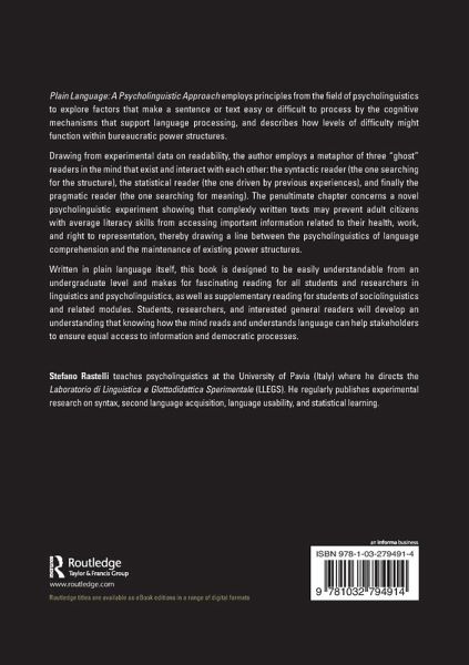 Written in plain language itself, this book is designed to be easily understandable from an undergraduate level and makes for fascinating reading for all students and researchers in linguistics and psycholinguistics, as well as supplementary reading for students of sociolinguistics and related modules. Students, researchers, and interested general readers will develop an understanding that knowing how the mind reads and understands language can help stakeholders to ensure equal access to information and democratic processes.