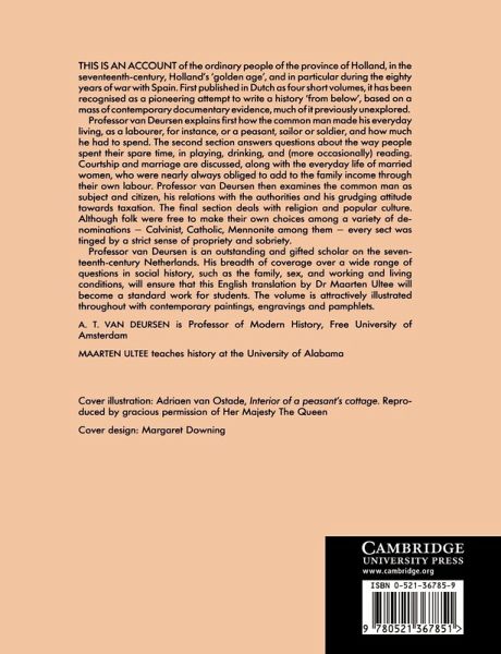 This is an account of the ordinary working people of Holland in the seventeenth-century, the so-called 'golden age'. Professor van Deursen is the most outstanding and gifted scholar at present working on this period of Dutch history. His history 'from below' is based on a mass of contemporary documentary evidence and the text is enlivened by contemporary illustrations. Ranging over a broad spectrum of everyday conditions, sex, marriage, leisure, religion and popular culture, this is the most comprehensive study yet published of the plain lives of a 'golden age'.