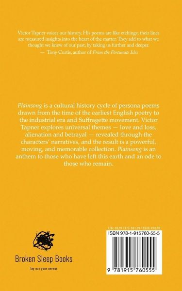 Plainsong is a cultural history cycle of persona poems drawn from the time of the earliest English poetry to the industrial era and Suffragette movement. Victor Tapner explores universal themes - love and loss, alienation and betrayal - revealed through the characters' narratives, and the result is a powerful, moving, and memorable collection. Plainsong is an anthem to those who have left this earth and an ode to those who remain.