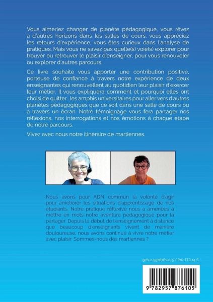Quand enseigner rime avec passion malgré les écrans. Et si découvriez notre vision du métier de prof ? Vous aimeriez changer de planète pédagogique, vous rêvez à d'autres horizons dans les salles de cours, vous appréciez les retours d'expérience, vous êtes curieux dans l'analyse de pratiques. Mais vous ne savez pas quelle(s) voie(s) explorer pour trouver ou retrouver le plaisir d'enseigner, pour vous renouveler ou explorer d'autres parcours. Ce livre souhaite vous apporter une contribution positive, porteuse de confiance à travers notre expérience de deux enseignantes qui renouvellent au quotidien leur plaisir d'exercer leur métier. Il vous expliquera comment et pourquoi elles ont choisi de quitter les amphis universitaires pour aller vers d'autres planètes pédagogiques que ce soit dans une salle de cours ou à travers un écran. Notre témoignange vous fera partager nos réflexions, nos intérrogations et nos émotions à chaque étape de notre parcours. Vivez avec nous notre itinéraire de martiennes.