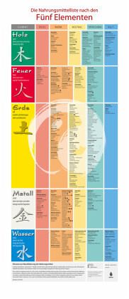 Dieses Poster zeigt die energetische Einteilung von über 200 Nahrungsmitteln nach den -Fünf Elementen- (trad. "5 Wandlungsphasen") gemäß der Chinesischen Medizin (TCM): "Holz", "Feuer", "Erde", "Metall" und "Wasser". Zudem werden diese Nahrungsmittel den thermischen Eigenschaften "heiß", "warm", "neutral", "erfrischend" und "kalt" zugeordnet. Ein schneller Blick auf die Klassifizierung der 200 gebräuchlichsten Nahrungsmittel ist für die individuelle TCM-Ernährungsberatung sowie für die -5 Elemente Küche- eine große Hilfe. Dieses Plakat ist Bestandteil aller Bücher von Barbara Temelie.