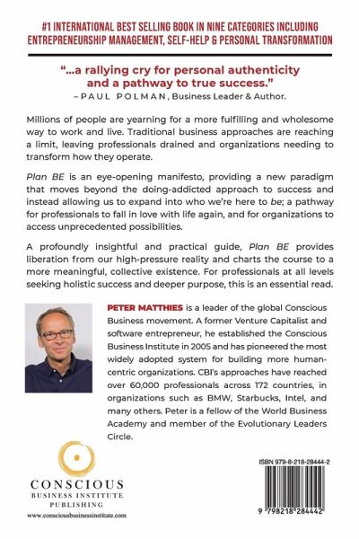 Plan BE takes us on a transformative journey towards a new paradigm of success - one that's not driven by Doing more and pushing ahead, but one that allows us to expand into who we're here to Be. In a world where traditional approaches to success often lead to exhaustion and burnout, with millions of people yearning for a more balanced and fulfilling way to work and live, Plan BE offers an alternative pathway that allows individuals to thrive and flourish while staying true to their authentic selves. Plan BE is not simply a how-to book; it is a book that makes the reader fall in love with life again. Insights and eye-opening revelations of how we tick open a room of possibility, authentic power, and satisfaction that many of us have sensed but struggled to access. Peter Matthies shares his own journey from being a software entrepreneur and venture capitalist to leaving his career, home country and marriage to discover the principles for building a life of well-being, wisdom and fulfillment. He founded the Conscious Business Institute in 2005 and has since delivered its groundbreaking approaches to more than 60,000 learners and 172 countries, in globally leading organizations including BMW, Starbucks, Intel, Allianz and Siemens. The deeply insightful and practical guidance Plan BE provides is a liberation from our pressure-cooker world. It paves the way for building a more fulfilling and purposeful life, both individually and collectively - a must-read for anyone seeking a more wholesome way of approaching success and accessing their deeper potential. Plan BE addresses fundamental cornerstones that have the power to transform our personal lives, our professions, our organizations, and our western way of life including: 1: Why our model of success isn't designed to make us happy, and what the alternative model looks like 2: The deeply engrained mechanism for all our struggle and suffering, and how to break away from it 3: Who we're here to be, and why this is the foundation for authentic success 4: Our deepest drivers, which provide us with happiness and fulfillment in our work and life 5: How we can access a state where work becomes flow 6: Our life purpose and our soul purpose 7: How to bring the new success model into our relationships and workplaces 8: How to build truly inspiring organizations.