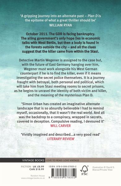 October 2011. While West Berlin enjoys all the trappings of capitalism on the crowded polluted Eastern side of the Wall the GDR is facing bankruptcy. The ailing government's only hope lies in economic talks with the West but then an ally of the GDR's chairman is found murdered - and all the clues suggest that his killer came from within the Stasi. Detective Martin Wegener is assigned to the case but with the future of East Germany hanging over him Wegener must work with the West German police if he is to find the killer even if it means investigating the Stasi themselves. It is a journey that will take him from Stasi meeting rooms to secret prisons as he begins to unravel the identity of both victim and killer and the meaning of the mysterious Plan D. Plan D is a gripping thriller and a thought-provoking alternative history in the vein of Robert Harris's Fatherland and John le Carré's The Spy Who Came in from the Cold.