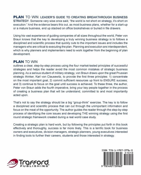Plan To Win: LEADER'S GUIDE TO CREATING BREAKTHROUGH BUSINESS STRATEGY. Someone very wise once said, "the world is not short on strategy, it's short on execution." And the evidence bears this out, as most business plans, whether for a start-up or a mature business, end up stacked on office bookshelves or buried in file drawers. Using his vast experience of guiding companies of all sizes throughout the world, Peter von Braun knows that the key to developing a truly winning business strategy is to follows a disciplined and scientific process that quickly cuts to the important issues and includes the managers who are critical to executing the plan. Planning and execution are interdependent, which is why planners and implementers need to work together from the beginning of plan development. Plan To Win outlines a clear, step-by-step process using the four market-tested principles of successful strategies and helps the reader avoid the most common mistakes of strategic business planning. As a serious student of military strategy, von Braun draws upon the great Prussian strategic thinker, Karl von Clausewitz, to provide the first three principles: 1) concentrate on the most important goal, 2) commit sufficient resources up front to ENSURE success; and 3) continue to focus on the goal until success is achieved. To these three, the author, Peter von Braun adds the fourth imperative, bring your key people together in the process of creating a business plan that will be understand, committed to and most importantly acted upon. That's not to say the strategy should be a big "group-think" exercise. The key is to follow a disciplined and scientific process that can cut through the unimportant information and focus on the meat of the opportunity. The author guides the reader through the step-by-step process of identifying the core issues and developing THE winning strategy using the first round strategic framework created during a real world case study. Creating a strategic plan is hard work, but by following the principles put forth in this book effectively and thoroughly, success is far more likely. This is a terrific book for business owners and executives, division managers, strategic planners, young executives interested in finding tools to further their careers, students and those interested in strategy.