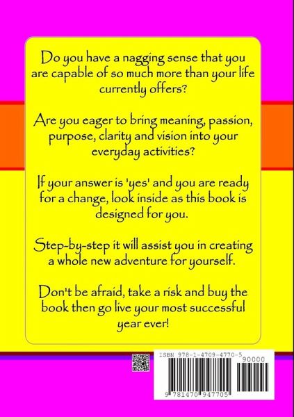 Are you eager to bring meaning, passion, purpose, clarity and vision into your everyday activities? Are you capable of so much more than your life currently seems to offer? Are ready for a change? Then take a look inside this book designed to step-by-step assist you in creating a whole new adventure. Don't be afraid, take a risk, buy the book and go live your most successful year ever!