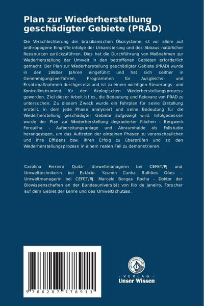 Die Verschlechterung der brasilianischen Ökosysteme ist vor allem auf anthropogene Eingriffe infolge der Urbanisierung und des Abbaus natürlicher Ressourcen zurückzuführen. Dies hat die Durchführung von Maßnahmen zur Wiederherstellung der Umwelt in den betroffenen Gebieten erforderlich gemacht. Der Plan zur Wiederherstellung geschädigter Gebiete (PRAD) wurde in den 1980er Jahren eingeführt und hat sich seither in Genehmigungsverfahren, Programmen für Ausgleichs- und Ersatzmaßnahmen durchgesetzt und ist zu einem wichtigen Steuerungs- und Kontrollinstrument für den ökologischen Wiederherstellungsprozess geworden. Ziel dieser Arbeit ist es, die Bedeutung und Relevanz von PRAD zu untersuchen. Zu diesem Zweck wurde ein Fahrplan für seine Erstellung erstellt, in dem jede Phase analysiert und seine Bedeutung für die Wiederherstellung geschädigter Gebiete aufgezeigt wird. Infolgedessen wurde der Plan zur Wiederherstellung degradierter Flächen - Bergwerk Forquilha - Aufbereitungsanlage und Abraumhalde als Fallstudie herangezogen, um das Auftreten der einzelnen Phasen zu veranschaulichen und ihre Effizienz bzw. ihren Erfolg zu überprüfen und so den Wiederherstellungsprozess in einem realen Fall zu demonstrieren.