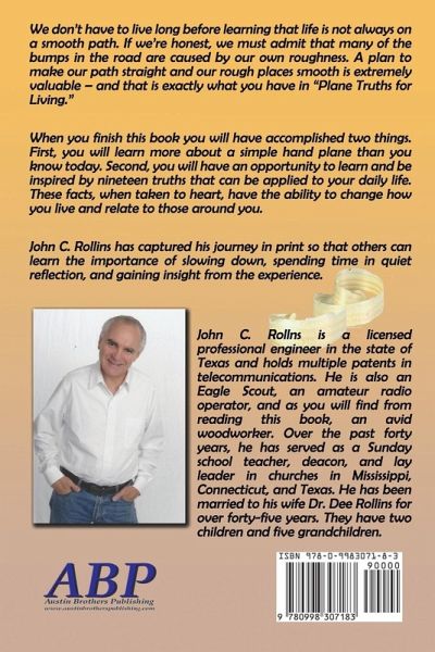 We don't have to live long before learning that life is not always on a smooth path. If we're honest, we must admit that many of the bumps in the road are caused by our own roughness. A plan to make our path straight and our rough places smooth is extremely valuable - and that is exactly what you have in "Plane Truths for Living." When you finish this book you will have accomplished two things. First, you will learn more about a simple hand plane than you know today. Second, you will have an opportunity to learn and be inspired by nineteen truths that can be applied to your daily life. These facts, when taken to heart, have the ability to change how you live and relate to those around you. John C. Rollins has captured his journey in print so that others can learn the importance of slowing down, spending time in quiet reflection, and gaining insight from the experience. This is an extremely practical book, presenting crucial life principles taken from observations of an everyday woodworking tool. You will be encouraged to discover simple things you can do to make your life and witness more effective.