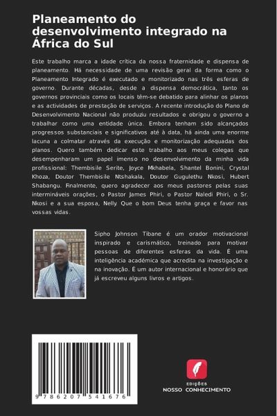 Este trabalho marca a idade crítica da nossa fraternidade e dispensa de planeamento. Há necessidade de uma revisão geral da forma como o Planeamento Integrado é executado e monitorizado nas três esferas de governo. Durante décadas, desde a dispensa democrática, tanto os governos provinciais como os locais têm-se debatido para alinhar os planos e as actividades de prestação de serviços. A recente introdução do Plano de Desenvolvimento Nacional não produziu resultados e obrigou o governo a trabalhar como uma entidade única. Embora tenham sido alcançados progressos substanciais e significativos até à data, há ainda uma enorme lacuna a colmatar através da execução e monitorização adequadas dos planos. Quero também dedicar este trabalho aos meus colegas que desempenharam um papel imenso no desenvolvimento da minha vida profissional: Thembisile Serite, Joyce Mkhabela, Shantel Bonini, Crystal Khoza, Doutor Thembisile Ntshakala, Doutor Gugulethu Nkosi, Hubert Shabangu. Finalmente, quero agradecer aos meus pastores pelas suas intermináveis orações, o Pastor James Phiri, o Pastor Naledi Phiri, o Sr. Nkosi e a sua esposa, Nelly. Que o bom Deus tenha graça e favor nas vossas vidas.