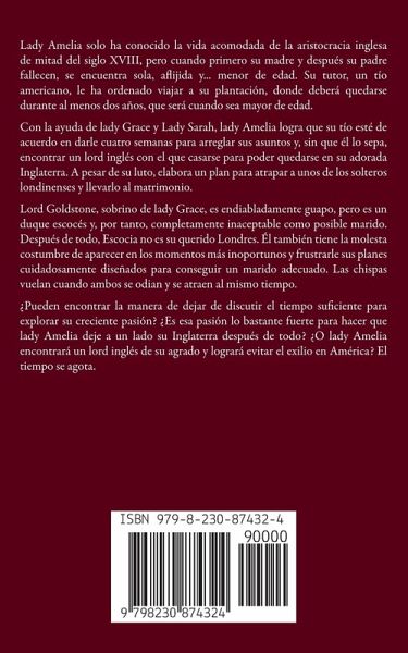 Lady Amelia solo ha conocido la vida acomodada de la aristocracia inglesa de mitad del siglo XVIII, pero cuando primero su madre y después su padre fallecen, se encuentra sola, aflijida y... menor de edad. Su tutor, un tío americano, le ha ordenado viajar a su plantación, donde deberá quedarse durante al menos dos años, que será cuando sea mayor de edad. Con la ayuda de lady Grace y Lady Sarah, lady Amelia logra que su tío esté de acuerdo en darle cuatro semanas para arreglar sus asuntos y, sin que él lo sepa, encontrar un lord inglés con el que casarse para poder quedarse en su adorada Inglaterra. A pesar de su luto, elabora un plan para atrapar a unos de los solteros londinenses y llevarlo al matrimonio. Lord Goldstone, sobrino de lady Grace, es endiabladamente guapo, pero es un duque escocés y, por tanto, completamente inaceptable como posible marido. Después de todo, Escocia no es su querido Londres. Él también tiene la molesta costumbre de aparecer en los momentos más inoportunos y frustrarle sus planes cuidadosamente diseñados para conseguir un marido adecuado. Las chispas vuelan cuando ambos se odian y se atraen al mismo tiempo. ¿Pueden encontrar la manera de dejar de discutir el tiempo suficiente para explorar su creciente pasión? ¿Es esa pasión lo bastante fuerte para hacer que lady Amelia deje a un lado su Inglaterra después de todo? ¿O lady Amelia encontrará un lord inglés de su agrado y logrará evitar el exilio en América? El tiempo se agota.