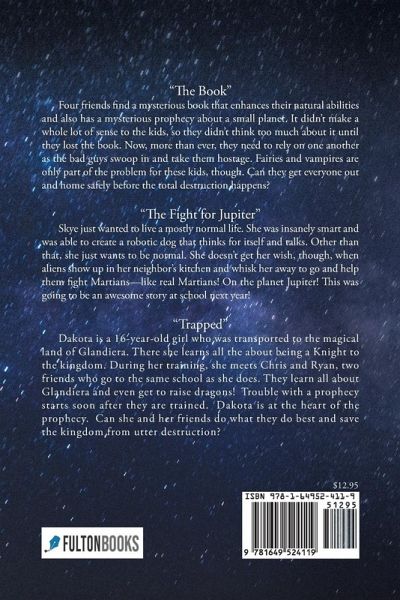 "The Book"Four friends find a mysterious book that enhances their natural abilities and also has a mysterious prophecy about a small planet. It didn't make a whole lot of sense to the kids, so they didn't think too much about it until they lost the book. Now, more than ever, they need to rely on one another as the bad guys swoop in and take them hostage. Fairies and vampires are only part of the problem for these kids, though. Can they get everyone out and home safely before the total destruction happens?"The Fight for Jupiter"Skye just wanted to live a mostly normal life. She was insanely smart and was able to create a robotic dog that thinks for itself and talks. Other than that, she just wants to be normal. She doesn't get her wish, though, when aliens show up in her neighbor's kitchen and whisk her away to go and help them fight Martians-like real Martians! On the planet Jupiter! This was going to be an awesome story at school next year!"Trapped"Dakota is a 16-year-old girl who was transported to the magical land of Glandiera. There she learns all the about being a Knight to the kingdom. During her training, she meets Chris and Ryan, two friends who go to the same school as she does. They learn all about Glandiera and even get to raise dragons! Trouble with a prophecy starts soon after they are trained. Dakota is at the heart of the prophecy. Can she and her friends do what they do best and save the kingdom from utter destruction?