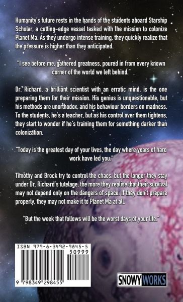 Humanity's future rests in the hands of the students aboard the Starship Scholar, a cutting-edge vessel tasked with the mission to colonize Planet Ma. As they undergo intense training, they quickly realize that the pressure is higher than they anticipated. "I see before me, gathered greatness, poured in from every known corner of the world we left behind" Dr. Richard, a brilliant scientist with an erratic mind, is the one preparing them for their mission. His genius is unquestionable, but his methods are unorthodox, and his behaviour borders on madness. To the students, he's a teacher, but as his control over them tightens, they start to wonder if he's training them for something darker than colonization. "Today is the greatest day of your lives, the day where years of hard work have led you" Timothy and Brock try to control the chaos, but the longer they stay under Dr. Richard's tutelage, the more they realise that their survival may not depend only on the dangers of space. If they don't prepare properly, they may not make it to Planet Ma at all. "But the week that follows will be the worst days of your life"