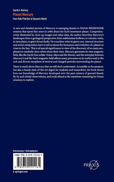 A new and detailed picture of Mercury is emerging thanks to NASA's MESSENGER mission that spent four years in orbit about the Sun's innermost planet. Comprehensively illustrated by close-up images and other data, the author describes Mercury's landscapes from a geological perspective: from sublimation hollows, to volcanic vents, to lava plains, to giant thrust faults. He considers what its giant core, internal structure and weird composition have to tell us about the formation and evolution of a planet so close to the Sun. This is of special significance in view of the discovery of so many exoplanets in similarly close orbits about their stars. Mercury generates its own magnetic field, like the Earth (but unlike Venus, Mars and the Moon), and the interplay between Mercury's and the Sun's magnetic field affects many processes on its surface and in the rich and diverse exosphere of neutral and charged particles surrounding the planet.