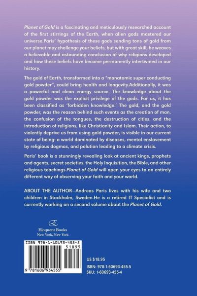 Planet of Gold is a fascinating and meticulously researched account of the first stirrings of the Earth, when alien gods mastered our universe. Paris' hypothesis of these gods sending tons of gold from our planet may challenge your beliefs, but with great skill, he weaves a believable and astounding conclusion of why religions developed and how these beliefs have become permanently intertwined in our history. The gold of Earth, transformed into a "monatomic super conducting gold powder", could bring health and longevity. Additionally, it was a powerful and clean energy source. The knowledge about gold powder was the explicit privilege of the gods. For us, it has been classified as 'forbidden knowledge.' The gold, and the gold powder, was the reason behind such events as the creation of man, the confusion of the tongues, the destruction of cities, and the introduction of religions, like Christianity and Islam. Their action, to violently deprive us from using gold powder, is visible in our current state of being: a world dominated by diseases, mental enslavement by religious dogmas, and pollution leading to a climate crisis. Paris' book is a stunningly revealing look at ancient kings, prophets and agents, secret societies, the Holy Inquisition, the Bible, and other religious teachings. Planet of Gold will open your eyes to an entirely different way of observing your faith and your world. ABOUT THE AUTHOR-Andreas Paris lives with his wife and two children in Stockholm, Sweden. He is a retired IT Specialist and is currently working on a second volume about the Planet of Gold.