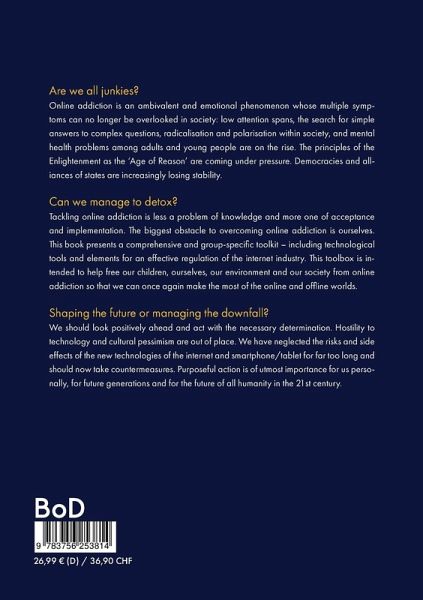 Are we all junkies? Online addiction is an ambivalent and emotional phenomenon whose multiple symptoms can no longer be overlooked in society: low attention spans, the search for simple answers to complex questions, radicalisation and polarisation within society, and mental health problems among adults and young people are on the rise. "Always online" with the smartphone is the new normal. All social groups are now affected by online addiction in varying degrees and suffer from the negative effects. The principles of the Enlightenment as the "Age of Reason" are coming under pressure. The concept of truth is dissolving. Traditional gatekeepers such as competent scientists and serious journalists / authors are being replaced by advertising-financed gatekeepers such as Google and Facebook. Democracies and alliances of states are increasingly losing stability.Can we manage to detox? Tackling online addiction is less a problem of knowledge and more one of acceptance and implementation. The biggest obstacle to overcoming online addiction is ourselves. This book describes the causes and effects of online addiction and presents a comprehensive and group-specific toolkit - including technological tools and elements for effective regulation of the internet industry. This toolbox is intended to help free our children, ourselves, our environment and our society from online addiction so that we can once again make the most of the online and offline worlds.Shaping the future or managing the downfall? We should look positively ahead and act with the necessary determination. Hostility towards technology and cultural pessimism are out of place. We have neglected the risks and side effects of the new technologies of the internet and smartphone / tablet for far too long and should now take countermeasures. Purposeful action is of utmost importance for us personally, for future generations and for the future of all humanity in the 21st century.