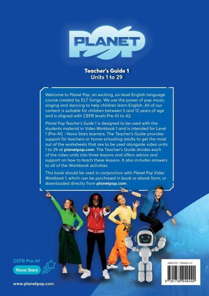 Welcome to Planet Pop, an exciting, six-level English language course created by ELT Songs. We use the power of pop music, singing and dancing to help children learn English. All of our content is suitable for children between 5 and 12 years of age and is aligned with CEFR levels Pre A1 to A2. Planet Pop Teacher's Guide 1 is designed to be used with the students material in Video Workbook 1 and is intended for Level 1 (Pre-A1) - Nova Stars learners. The Teacher's Guide provides support for teachers or home-schooling adults to get the most out of the worksheets that are to be used alongside video units 1 to 29 at planetpop.com. The Teacher's Guide divides each of the video units into three lessons and offers advice and support on how to teach these lessons. It also includes answers to all of the Workbook activities. This book should be used in conjunction with Planet Pop Video Workbook 1, which can be purchased in book or ebook form, or downloaded directly from planetpop.com.