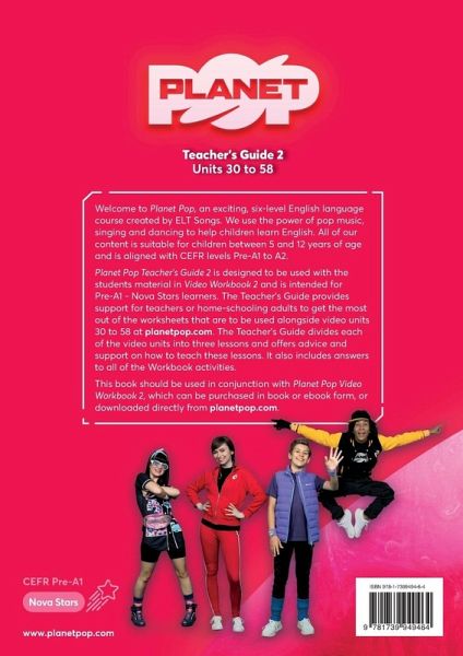 Welcome to Planet Pop, an exciting, six-level English language course created by ELT Songs. We use the power of pop music, singing and dancing to help children learn English. All of our content is suitable for children between 5 and 12 years of age and is aligned with CEFR levels Pre A1 to A2. Planet Pop Teacher's Guide 2 is designed to be used with the students material in Video Workbook 2 and is intended for Pre-A1 - Nova Stars learners. The Teacher's Guide provides support for teachers or home-schooling adults to get the most out of the worksheets that are to be used alongside video units 30 to 58 at planetpop.com. The Teacher's Guide divides each of the video units into three lessons and offers advice and support on how to teach these lessons. It also includes answers to all of the Workbook activities. This book should be used in conjunction with Planet Pop Video Workbook 2, which can be purchased in book or ebook form, or downloaded directly from planetpop.com.