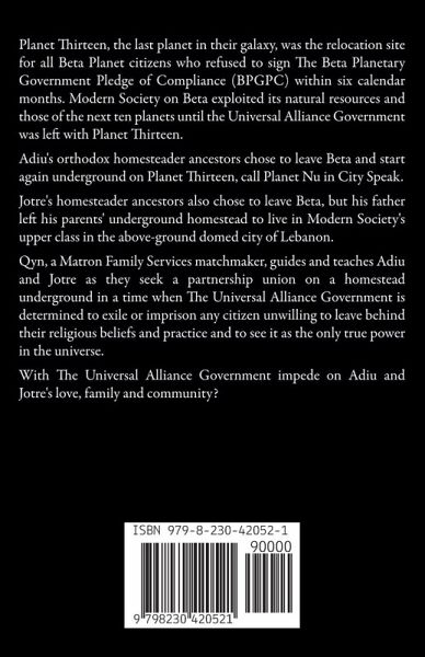 Planet Thirteen, the last planet in their galaxy, was the relocation site for all Beta Planet citizens who refused to sign The Beta Planetary Government Pledge of Compliance (BPGPC) within six calendar months. Modern Society on Beta exploited its natural resources and those of the next ten planets until the Universal Alliance Government was left with Planet Thirteen. Adiu's orthodox homesteader ancestors chose to leave Beta and start again underground on Planet Thirteen, call Planet Nu in City Speak. Jotre's homesteader ancestors also chose to leave Beta, but his father left his parents' underground homestead to live in Modern Society's upper class in the above-ground domed city of Lebanon. Qyn, a Matron Family Services matchmaker, guides and teaches Adiu and Jotre as they seek a partnership union on a homestead underground in a time when The Universal Alliance Government is determined to exile or imprison any citizen unwilling to leave behind their religious beliefs and practice and to see it as the only true power in the universe. With The Universal Alliance Government impede on Adiu and Jotre's love, family and community?