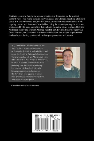 On Znski-a world fraught by rivalry and age-old enmities, a world dominated by the sentient Lizzardi race-two ruling families, the Voshiaddas and Clonces, negotiate a tentative peace. But one embittered heir, Divilli Clonce, orchestrates the assassination of his reigning parents, framing the Voshiaddas and Western Alliance for his crime. Divilli manipulates the resulting outrage from his home continent of Sweftlin and leads a rebellion against his foes that threatens to embroil the entire planet in a volatile dispute. Only the Voshiadda family and their allies can stop him. Aging leader Caslimodi Voshiadda looks first to diplomatic solutions, trying to secure a peace for his sons, the future leaders of Alagora. But when Divilli's growing forces threaten with revamped warships and menacing technology, the Voshiadda family and their allies face impending defeat. Ultimately, in their quest for survival, their epic plight pits them against Divilli's Divclonzi Warriors on both land and space, in fiery confrontations that span generations and planets.