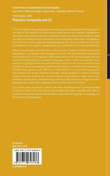 Addressing this gap in the literature, the respective chapters outline many topics pertaining to cartography and mapping such as the role and definition of planetary cartography and (vs?) Geographic Information Science; theoretical background and practical methodologies in geological mapping; science-ready versus public-ready products; a goal/procedure-focused practical manual of the most commonly used software in planetary mapping, which includes generic (ArcGISand its extensions, JMARS) and specific tools (HiView, Cratertools etc.); extracting topographic information from images; thematic mapping: climate; geophysics; surface modeling; change detection; landing site selection; shared maps; dynamic maps on the web; planetary GIS interfaces; crowdsourcing; crater counting techniques; irregular bodies; geological unit symbology; mapping center activities; and web services.