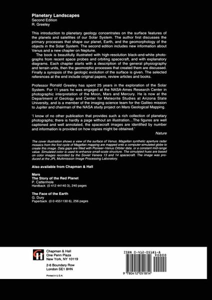 ...the definitive summary text for undergraduate students of surface processes... - Journal of the British Astronomy Association; Review of the first edition: I know of no other publication that provides such a rich collection of planetary photographs - there is hardly a page with out an illustration, and many cover almost the entire 11 x 8.5 format. The figures are well captioned and annotated, the spacecraft images are identified by number and information is provided on how copies might be obtained. - Nature; The reproduction of the images...is among the best I have seen...The overall effect is stunning - Nature; ...the definitive summary text for undergraduate students of surface processes... - Journal of the British Astronomy Association; Review of the first edition: I know of no other publication that provides such a rich collection of planetary photographs - there is hardly a page with out an illustration, and many cover almost the entire 11 x 8.5 format. The figures are well captioned and annotated, the spacecraft images are identified by number and information is provided on how copies might be obtained. - Nature; The reproduction of the images...is among the best I have seen...The overall effect is stunning - Nature; ...the definitive summary text for undergraduate students of surface processes... - Journal of the British Astronomy Association; Review of the first edition: I know of no other publication that provides such a rich collection of planetary photographs - there is hardly a page with out an illustration, and many cover almost the entire 11 x 8.5 format. The figures are well captioned and annotated, the spacecraft images are identified by number and information is provided on how copies might be obtained. - Nature; The reproduction of the images...is among the best I have seen...The overall effect is stunning - Nature