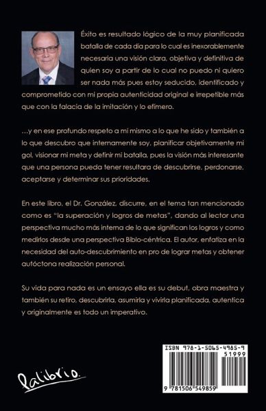 Éxito es resultado lógico de la muy planificada batalla de cada día para lo cual es inexorablemente necesaria una visión clara, objetiva y definitiva de quien soy a partir de lo cual no puedo ni quiero ser nada más pues estoy seducido, identificado y comprometido con mi propia autenticidad original e irrepetible más que con la falacia de la imitación y lo efímero. ...y en ese profundo respeto a mí mismo a lo que he sido y también a lo que descubro que internamente soy, planificar objetivamente mi gol, visionar mi meta y definir mi batalla, pues la visión más interesante que una persona pueda tener resultara de descubrirse, perdonarse, aceptarse y determinar sus prioridades. En este libro, el Dr. González, dinscurre, en el tema tan mencionado como es "la superación y logros de metas", dando al lector una perspectiva mucho más interna de lo que significan los logros y como medirlos desde una perspectiva Bíblo-céntrica. El autor, enfatiza en la necesidad del auto-descubrimiento en pro de lograr metas y obtener autóctona realización personal. Su vida para nada es un ensayo ella es su debut, obra maestra y también su retiro, descubrirla, asumirla y vivirla planificada, autentica y originalmente es todo un imperativo.