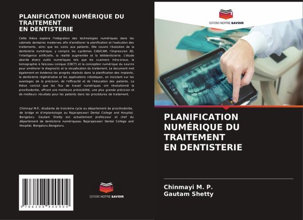 Cette thèse explore l'intégration des technologies numériques dans les cabinets dentaires modernes afin d'améliorer la planification et l'exécution des traitements, ainsi que les soins aux patients. Elle couvre l'évolution de la dentisterie numérique, y compris les systèmes CAD/CAM, l'impression 3D, l'intelligence artificielle, la réalité augmentée et la télédentisterie. L'étude aborde divers outils numériques tels que les scanners intra-oraux, la tomographie à faisceau conique (CBCT) et la conception numérique du sourire pour améliorer le diagnostic et la visualisation du traitement. Le document met également en évidence les progrès réalisés dans la planification des implants, la dentisterie régénérative et les applications robotiques, en insistant sur les avantages de la précision, de l'efficacité et de l'éducation des patients. La thèse conclut que les flux de travail numériques ont révolutionné la prosthodontie, offrant une meilleure prévisibilité, une plus grande précision et de meilleurs résultats pour les patients dans les procédures de traitement.