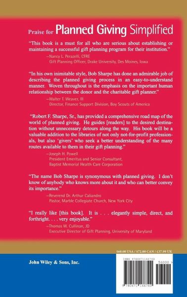 Praise for Planned Giving Simplified "This book is a must for all who are serious about establishing or maintaining a successful gift planning program for their institution." --Nancy L. Perazelli, CFRE Gift Planning Officer, Drake University, Des Moines, Iowa "In his own inimitable style, Bob Sharpe has done an admirable job of describing the planned giving process in an easy-to-understand manner. Woven throughout is the emphasis on the important human relationship between the donor and the charitable gift planner." --Walter T. Weaver, III Director, Finance Support Division, Boy Scouts of America "Robert F. Sharpe, Sr., has provided a comprehensive road map of the world of planned giving. He guides [readers] to the desired desti- nation without unnecessary detours along the way. His book will be a valuable addition to the libraries of not only not-for-profit profession-als, but also 'givers' who seek a better understanding of the many routes available to them in their gift planning." --Joseph H. Powell President Emeritus and Senior Consultant, Baptist Memorial Health Care Corporation "The name Bob Sharpe is synonymous with planned giving. I don't know of anybody who knows more about it and who can better convey its importance." --Reverend Dr. Arthur Caliandro Pastor, Marble Collegiate Church, New York City "I really like [this book]. It is . . . elegantly simple, direct, and forthright. . . . very enjoyable." --Thomas W. Cullinan, JD Executive Director of Gift Planning, University of Maryland