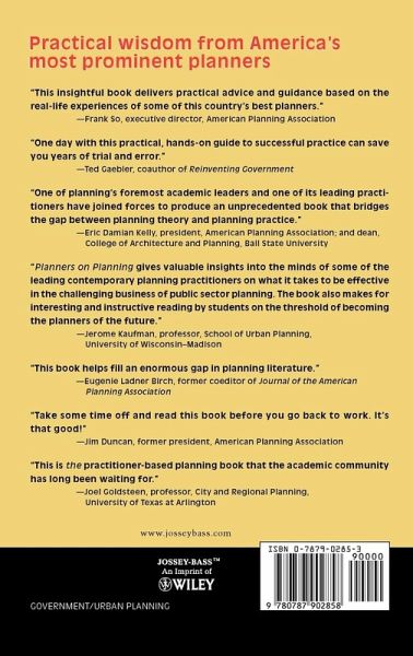 Perhaps at no time in history have we experienced social, political, and economic changes occurring as rapidly as today. As a result, planners and other public officials are being asked to address critical community needs better, faster, and with fewer resources than ever before. Planners on Planning offers pragmatic information on the realities of day-to-day practice from some of the most innovative, respected, and visionary leaders in the planning profession today. Bridging the gap between theory and practice, the book provides straightforward lessons from today's most effective planners on the core values, skills, and techniques needed for success. Through personal, real-life examples from the trenches, these experts explain in their own words what works, what doesn't, and why. Their invaluable first-hand advice includes: * Ten habits of highly effective planners * Commitments that enable planners to increase effectiveness and productivity * Guidelines for survival and success when dealing with the politics of planning * Principles and practices for effective visioning and goals-setting * Tips for gaining credibility and trust * Operating principles for top-quality customer service * Advice on becoming an effective planning director with job longevity * Why and how to become more entrepreneurial The planning profession is in the midst of great change and is actively reinventing itself-developing new ways of doing things and new ways of thinking about communities. With this book, planners will learn from the experiences of some of America's best planners how to restructure, reinvent, and renew the practice of their profession.