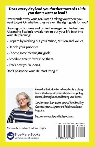 Does every day lead you further towards a life you don't want to lead? Ever wonder why your goals aren't taking you where you want to go? Or whether they're even the right goals for you? Drawing on business and project management techniques Alexandria Blaelock reveals how to put your life back into your life planning: ¿ Prepare by working out your Vision, Mission and Values. ¿ Decide your priorities. ¿ Choose some meaningful goals. ¿ Schedule time to "work" on them. ¿ Track how you're doing. Don't postpone your life, start living it!