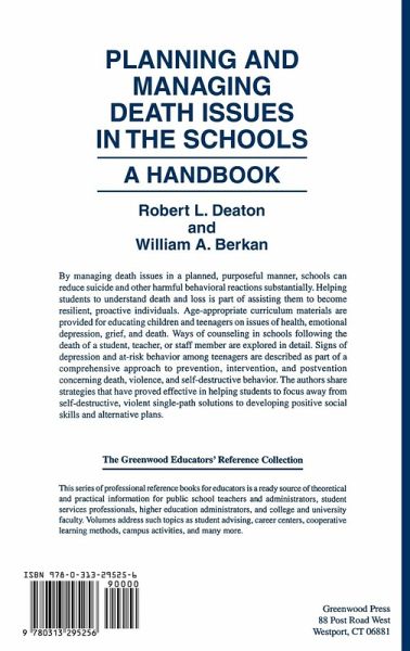 By managing death issues in a planned purposeful manner, schools can reduce suicide and other harmful behavioral reactions substantially. Helping students to understand death and loss is part of assisting them to become resilient, proactive individuals. Age-appropriate curriculum materials are provided for educating children and teenagers on issues of health, emotional depression, grief, and death. Ways of counseling in schools following the death of a student, teacher, or staff member are explored in detail. Signs of depression and at-risk behavior among teenagers are described as part of a comprehensive approach to prevention, intervention, and postvention concerning death, violence, and self-destructive behavior. The authors share strategies that have proved effective in helping students to focus away from self-destructive, violent single-path solutions to developing positive social skills and alternative plans. Developing a comprehensive school plan in anticipation of a death occurrence and training staff in its implementation greatly reduces emotional stress.