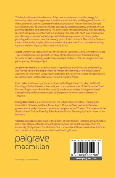 'his book constitutes an effort in the right ... as the case study method research methodology promises to be an effective tool for research and teaching that deepens our contextualized understanding of the urbanization realities in Africa. I recommend researchers and lecturers of graduate and postgraduate students in planning and architecture to read this book for it should inform their research approach, relevant education curricula and teaching methods. Students may particularly read it in order to demand quality education that will appropriately equip them to be relevant planners and architects.' - Tumsifu Jonas Nnkya, Urban Africa