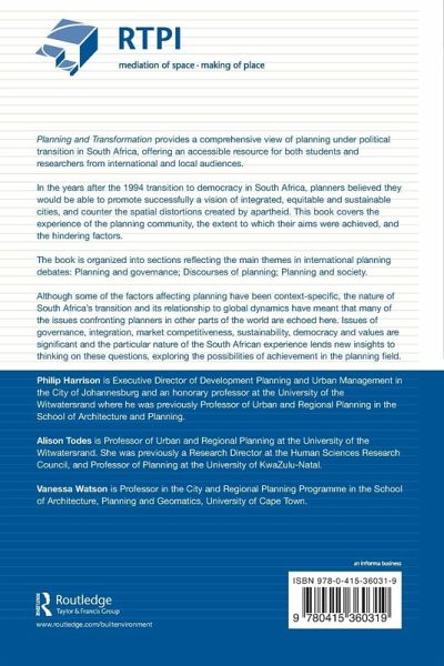 Planning and Transformation provides a comprehensive view of planning under political transition in South Africa, offering an accessible resource for both students and researchers in an international and a local audience. In the years after the 1994 transition to democracy in South Africa, planners believed they would be able to successfully promote a vision of integrated, equitable and sustainable cities, and counter the spatial distortions created by apartheid. This book covers the experience of the planning community, the extent to which their aims were achieved, and the hindering factors. Although some of the factors affecting planning have been context-specific, the nature of South Africa's transition and its relationship to global dynamics have meant that many of the issues confronting planners in other parts of the world are echoed here. Issues of governance, integration, market competitiveness, sustainability, democracy and values are significant, and the particular nature of the South African experience lends new insights to thinking on these questions, exploring the possibilities of achievement in the planning field.