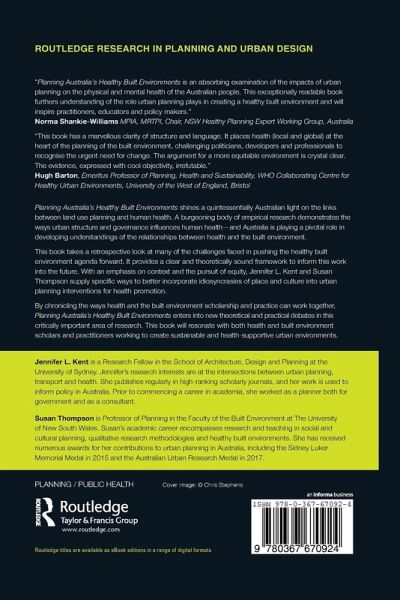 Planning Australia's Healthy Built Environments shines a quintessentially Australian light on the links between land use planning and human health. A burgeoning body of empirical research demonstrates the ways urban structure and governance influences human health-and Australia is playing a pivotal role in developing understandings of the relationships between health and the built environment. This book takes a retrospective look at many of the challenges faced in pushing the healthy built environment agenda forward. It provides a clear and theoretically sound framework to inform this work into the future. With an emphasis on context and the pursuit of equity, Jennifer L. Kent and Susan Thompson supply specific ways to better incorporate idiosyncrasies of place and culture into urban planning interventions for health promotion. By chronicling the ways health and the built environment scholarship and practice can work together, Planning Australia's Healthy Built Environments enters into new theoretical and practical debates in this critically important area of research. This book will resonate with both health and built environment scholars and practitioners working to create sustainable and health-supportive urban environments.