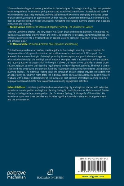 This textbook provides an accessible, practical guide to the strategic planning process required for the preparation of city plans from entire metropolitan areas to town centres. It fills a gap in the academic literature on the topic of strategic planning. Its conceptual and practical content together with a student friendly style and high use of practical examples make it accessible to both the student and recent graduate. Its presentation in three parts allows the reader or course leader to access those sections relevant to either their learning requirements or day-to-day work activities. The book is clearly structured into three-parts and provides flexibility in approach and learning for students taking relevant planning courses. The extensive reading list at the conclusion of each chapter provides the student with an opportunity to explore in more detail the individual topics. The practical approach equips the recent graduate with a deeper understanding of the purpose of eachelement of strategic planning from how to prepare a research brief to how to approach community engagement activities.