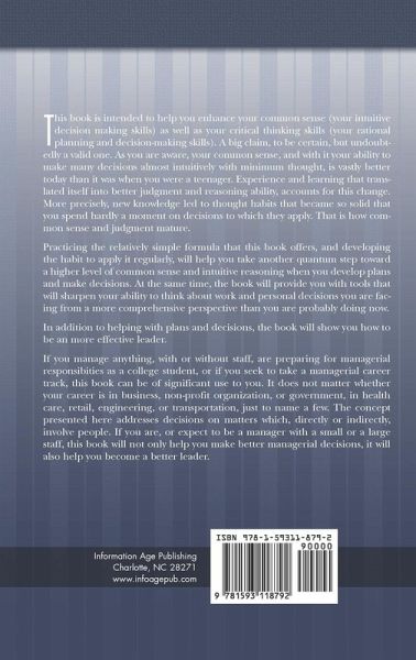 This book is intended to help you enhance your common sense (your intuitive decision making skills) as well as your critical thinking skills (your rational planning and decision-making skills). A big claim, to be certain, but undoubtedly a valid one. As you are aware, your common sense, and with it your ability to make many decisions almost intuitively with minimum thought, is vastly better today than it was when you were a teenager. Experience and learning that translated itself into better judgment and reasoning ability, accounts for this change. More precisely, new knowledge led to thought habits that became so solid that you spend hardly a moment on decisions to which they apply. That is how common sense and judgment mature. Practicing the relatively simple formula that this book offers, and developing the habit to apply it regularly, will help you take another quantum step toward a higher level of common sense and intuitive reasoning when you develop plans and make decisions. At the same time, the book will provide you with tools that will sharpen your ability to think about work and personal decisions you are facing from a more comprehensive perspective than you are probably doing now. In addition to helping with plans and decisions, the book will show you how to be an more effective leader. If you manage anything, with or without staff, are preparing for managerial responsibities as a college student, or if you seek to take a managerial career track, this book can be of significant use to you. It does not matter whether your career is in business, non-profit organization, or government, in health care, retail, engineering, or transportation, just to name a few. The concept presented here addresses decisions on matters which, directly or indirectly, involve people. If you are, or expect to be a manager with a small or a large staff, this book will not only help you make better managerial decisions, it will also help you become a better leader. However, even if you are on a professional track where you manage a function, but do not, or will not have anyone reporting to you, your work still has impact on people. In these professional positions the leadership aspects of your managerial responsibilities may just be of smaller impact, overall, on your plans and decisions. You will, nevertheless bring better results if you consider many of the thoughts and concepts discussed here. Moreover, most professionals are frequently in positions on teams or projects where they are likely to assume leadership responsibilities. In these situations, the concepts discussed in this book can be most useful. Even where your leadership and management responsibilities, and decisions, involve family affairs, most of the sections of this book can be valuable. They address key issues for decision- making and interpersonal relations, and they do it from a unique and comprehensive perspective.