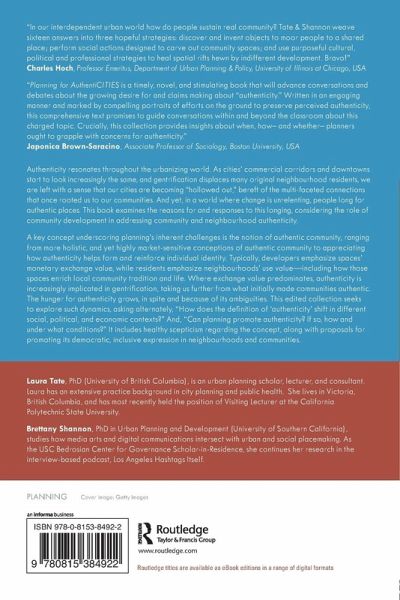 Authenticity resonates throughout the urbanizing world. As cities' commercial corridors and downtowns start to look increasingly the same, and gentrification displaces many original neighborhood residents, we are left with a sense that our cities are becoming "hollowed out," bereft of the multi-faceted connections that once rooted us to our communities. And yet, in a world where change is unrelenting, people long for authentic places. This book examines the reasons for and responses to this longing, considering the role of community development in addressing community and neighbourhood authenticity. A key concept underscoring planning's inherent challenges is the notion of authentic community, ranging from more holistic, and yet highly market-sensitive conceptions of authentic community to appreciating how authenticity helps form and reinforce individual identity. Typically, developers emphasize spaces' monetary exchange value, while residents emphasize neighbourhoods' use value-including how those spaces enrich local community tradition and life. Where exchange value predominates, authenticity is increasingly implicated in gentrification, taking us further from what initially made communities authentic. The hunger for authenticity grows, in spite and because of its ambiguities. This edited collection seeks to explore such dynamics, asking alternately, "How does the definition of 'authenticity' shift in different social, political, and economic contexts?" And, "Can planning promote authenticity? If so, how and under what conditions?" It includes healthy scepticism regarding the concept, along with proposals for promoting its democratic, inclusive expression in neighbourhoods and communities.